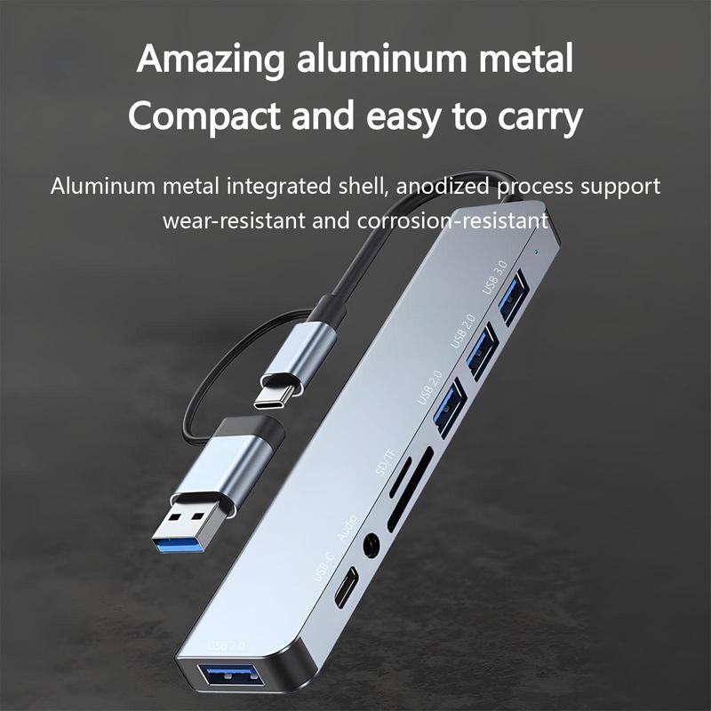 Portable 8 Ports USB Hub, USB 3.0/2.0/Micro SD/TF Card Reader, Multifunctional Universal Adapter for Laptop, MacBook Pro, iPad And Other USB-C Devices