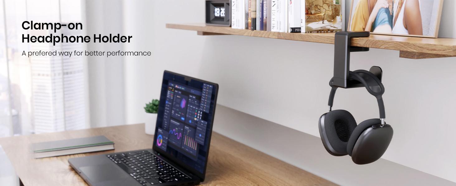 【Clamp-on Headphone Stand】The E-Hold Series headphone holder fits desks from 0.31 inch to 1.57 inch thick, making it a versatile choice for most setups. The spring clamp is a breeze to remove and reattach. No glue, no mess. It blends seamlessly into your space, whether it's your desk, shelf, or other surface.